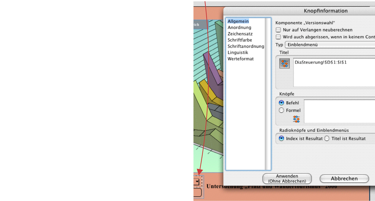 The start button itself is simple: under «Button Information ➝ General ➝ Title», enter the word «START», select «Push Buttons ➝ Command» and enter «Slide Show» as the command. Then all you have to do is select «Return Their Index». And what does the button trigger? The layout on which the button is located is displayed as a slide show according to the control in the spreadsheet. The slide show then runs endlessly until you cancel it with 0. In the yellow field, you can enter the number of seconds after which each slide should change.