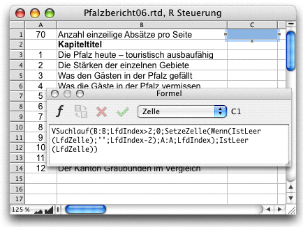 The «R Control» spreadsheet (see Fig. 4.59) looks slightly different from the simple document in chapter “Formulas Part 3: In full swing”. There will be a number in cell A1 – enter «70» for now and add the explanation «Number of single-line paragraphs per page» in cell B1. This will make it easier for you to deal with the blank page later on. The formula in cell C1 (Formula 4.12), which calculates the chapter numbers, is a vertical search and enters the chapter number consecutively in column A as soon as an entry with a chapter title is made in column B in the respective row. In cell B2, enter «Chapter Title» as the heading. Below that, starting in cell B3, enter your chapter titles.