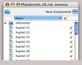 If a single RagTime document becomes so large that it is almost impossible to work with, then there is no other option than to create a separate document for each chapter. This is clearly the most complex solution. However, it also offers the best protection against data loss if a document suddenly becomes corrupted for any reason. Such disasters can be prevented by making frequent backup copies. This is particularly recommended if you want to create a work such as this book with RagTime. Always keep several generations of these copies and do not simply overwrite the previous one with the new one. We have created such a document and will make it available on the website www.pumera.ch, as it would go beyond the scope of this book.
