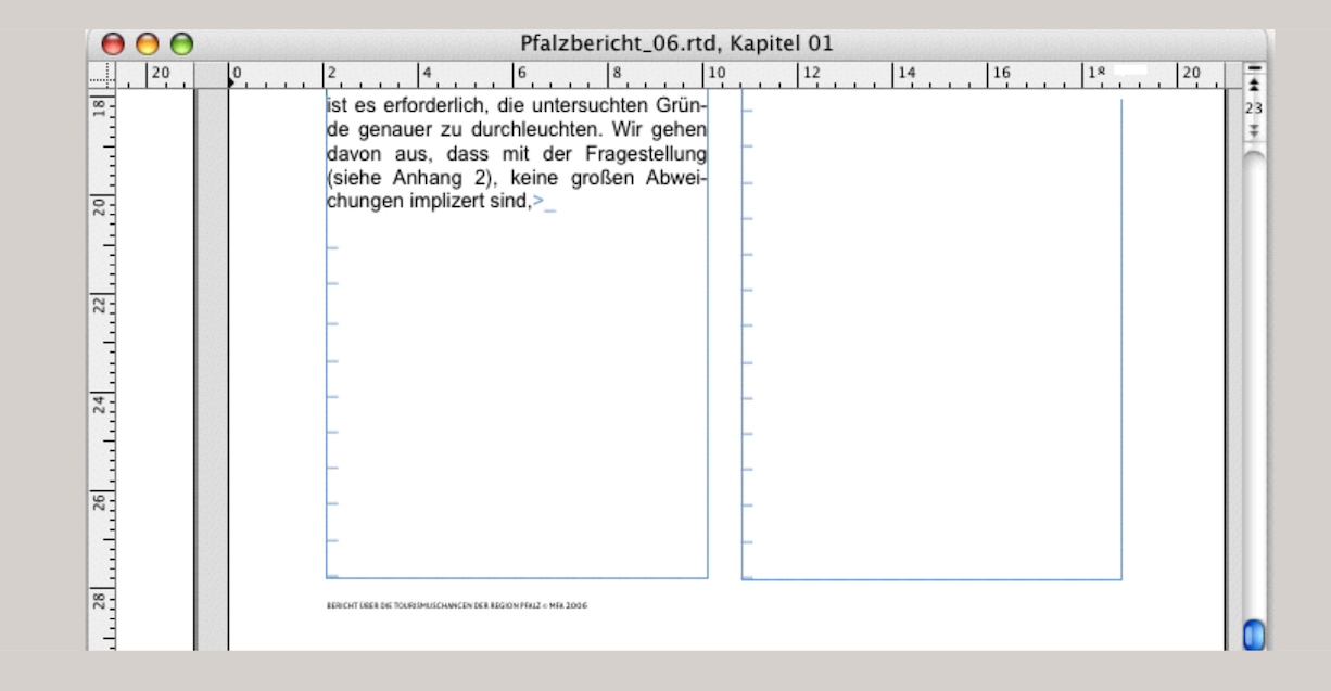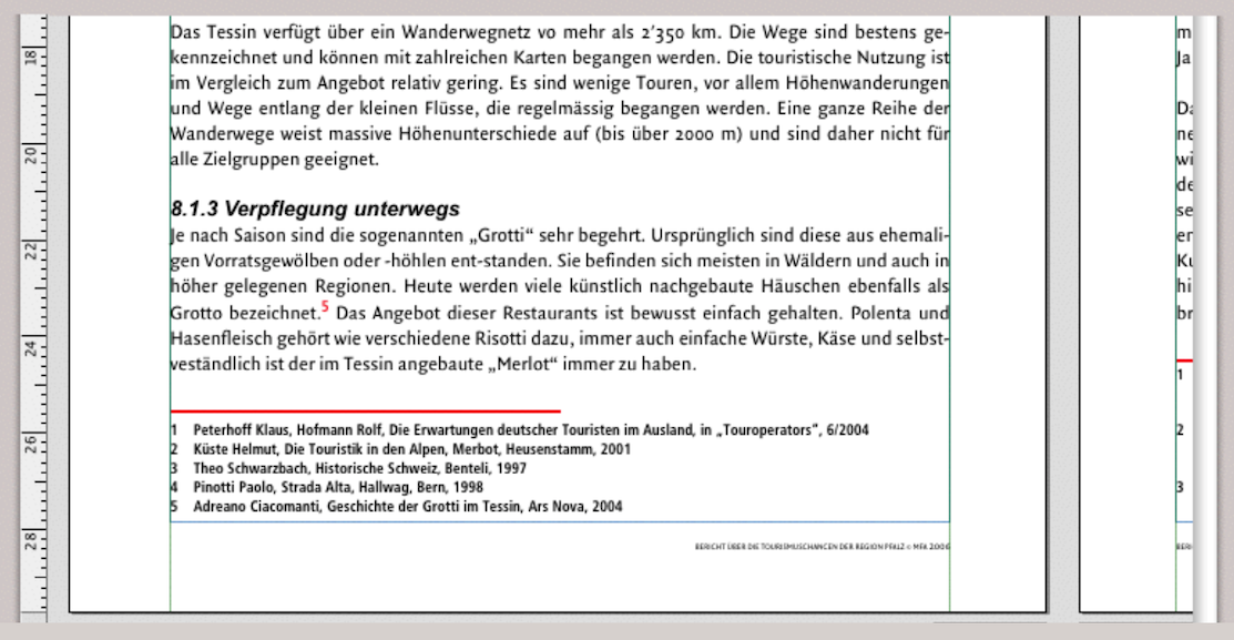 ) or select «Text ➝ Insert Footnote» and RagTime will insert a sequential number (or a selected character) at the insertion point in the text and, depending on the settings, a line and the footnote symbol at the end of the page or chapter. The insertion point will then flash there so that you can enter the footnote. Write your footnote and click back into the main text to continue. Functionally, it's not complicated, but a number of settings are necessary for the design. This is no problem for a single-column text across the entire width of the type area. But as soon as you work with a two-column layout or use the baseline grid, the typography no longer looks quite as pleasing.