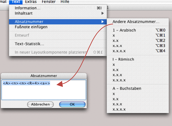 The prepared commands for paragraph numbers in RagTime support up to 4 levels of decimal classification. For additional levels or mixed display (Arabic numerals, Roman numerals, letters), the convention in Fig. 4.65 applies. With each new entry under «Text ➝ Paragraph Numbers ➝ xyx», RagTime counts the next consecutive number, where «xyx» stands for your chosen counting convention.