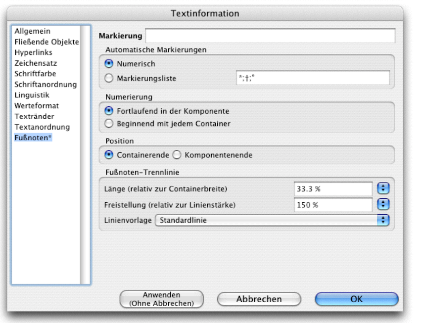 If you want to use a special character that is not available in the current character set, you must first search for the desired character via «Edit ➝ Insert Symbol», copy it, and then reopen the text information window for the footnote to insert it there. Of course, only characters from the character sets are possible; images or drawings are not allowed. The next settings relate to numbering – whether it should be continuous throughout the entire text component or start over again with each new container. This also depends on your layout design. The same applies to the «Position» setting. If you have selected «At End of Containers», a footnote bar will appear in both columns in a two-column layout (with two containers). If, for example, you want the footnotes at the end of the chapter, you must interrupt the pipeline of your text containers there and start a new pipeline again in the next chapter.