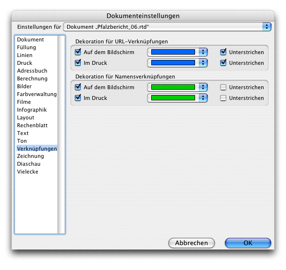 Links are possible in RagTime 7 in all texts, both in text components and in graphic text, and even in spreadsheets. RagTime offers two options for creating interactive connections in text passages: links within a document and links as hyperlinks to websites. Under «Document Settings ➝ Hyperlinks», you can specify the colors and underlining for both types of links (Fig. 4.73).