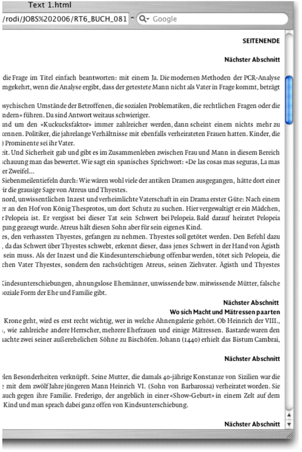 Under «File ➝ Export to HTML…» the «HTML Export Options» window opens. You can see this panel in Fig. 4.80. In the first selection menu, you can define either the entire layout or a selection. The component that is currently activated with the pointer is always selected. Here, it is the text component. In addition, the export setting «Export Everything to a Single HTML Page» has been selected. Previously, we inserted special link texts in this text component (circled in red). At the start, there was a linked text that led to the end of the text and one that led to the next section of text. From each section of text, a marked text led to the next, and so on (see the «Name Editor» palette in Fig. 4.80). This worked as desired in the original RagTime document. However, it did not work in the HTML page in the browser. The links did not work. What a shame for all that work. Nevertheless, the text was “Internet compatible” (see Fig. 4.81). But let's move on to the export settings. The main questions for «Export Strategy» are as follows: do you want the layout to appear as accurately as possible on the website? Then the only option is «Convert Everything to Images». Or would you like your text to be directly copyable from the website? Then the option «Convert to Image as Rarely as Possible» is the right choice. We call the middle option button the “doubt button” because it leaves you in doubt about the outcome either way … You will see that a lot of HTML export has to do with trial and error. This also applies to the «Reduce Font Sizes by … Pixels» setting. As a rule, a value of 1 or 2 will result in a better font appearance on the website. The options under «Other Settings» are self-explanatory. Under «Page Navigation», the options «None», «At Top of Pages», «At Bottom of Pages», and «At Top and Bottom of Pages» are available. The corresponding navigation texts then appear on the website (see Fig. 4.83).