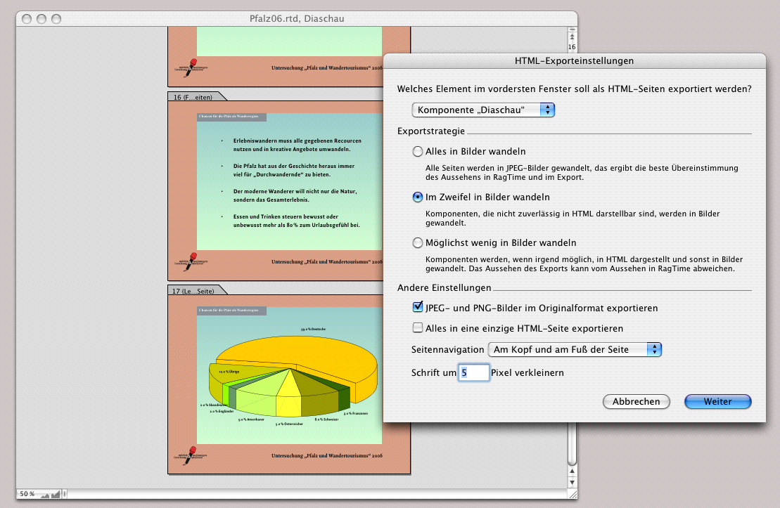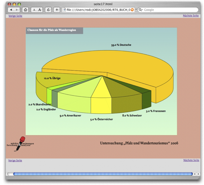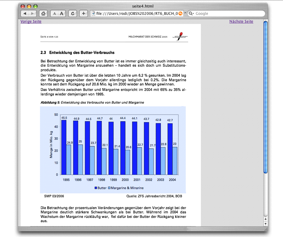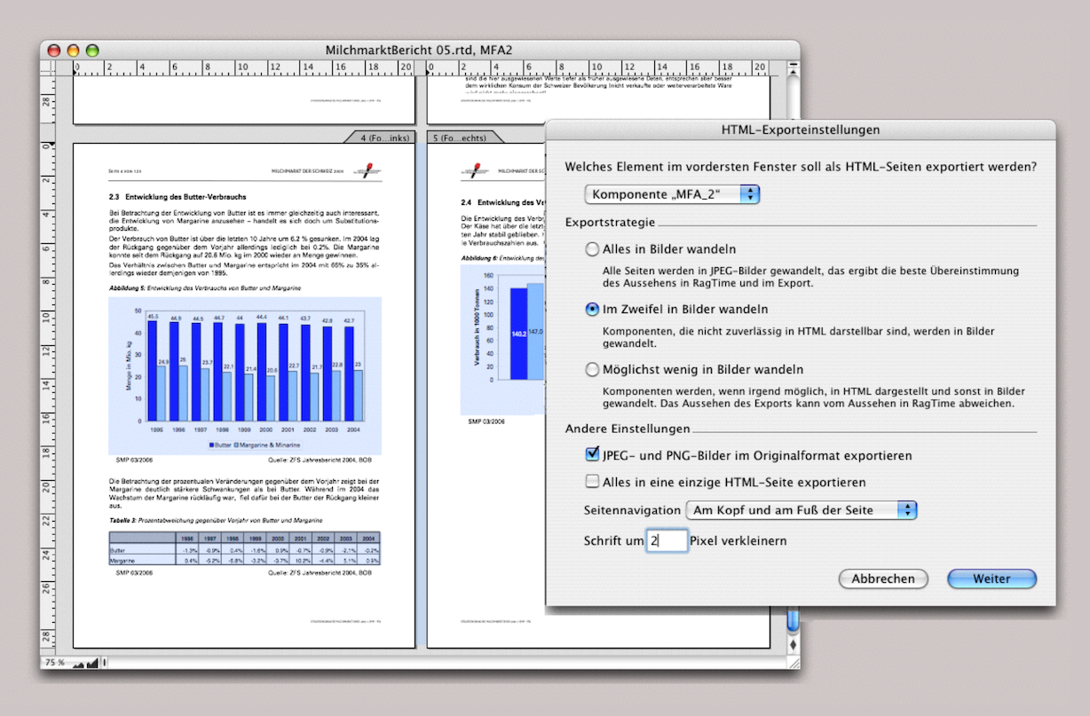 In the second example, the entire layout was selected as a component. In addition, the navigation «At Top and Bottom of Pages» was selected. This solution is also appealing. However, the graphics and tables in the original document were images. In the third attempt, the entire layout was also converted. The layout consisted of graphs, EPS images, graphic text, and text components. The result in the browser was satisfactory (see Fig. 4.84). Only the setting «Reduce Font Sizes by 5 Pixels» was an attempt that was not satisfactory. The smaller negative font in the gray bar became illegible. In summary: this export functionality is suitable for smaller and spontaneous web publications. For comprehensive, functional websites, RagTime can be a good starting point for further processing the files with specialized website design programs.