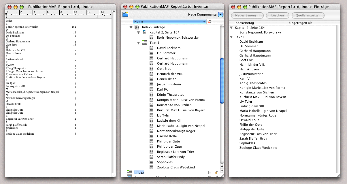 Let's assume we have selected all the desired terms in the text and then triggered the «Generate Index» command. Our index could then look like Fig. 4.90: on the left, the open text component of the index; in the middle, the index entries in the Inventory (from the auxiliaries folder); and on the right, the «Index Entries Editor». palette.