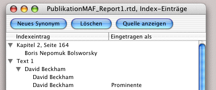Case 4: The main text contains «David Beckham» as a marked index term. In the index, it should firstly appear under various keywords (synonyms) and secondly be accompanied by notes. Therefore, create three new synonyms. Enter «Beckham, David, football player» as the main term, «see Beckham, David» as the synonym terms, and the keywords under which this name should be listed (in this case, «Family Men», «Celebrities» and «Athletes») under «Entered as». In the text component, «see Beckham, David» can then be found under each of these keywords.