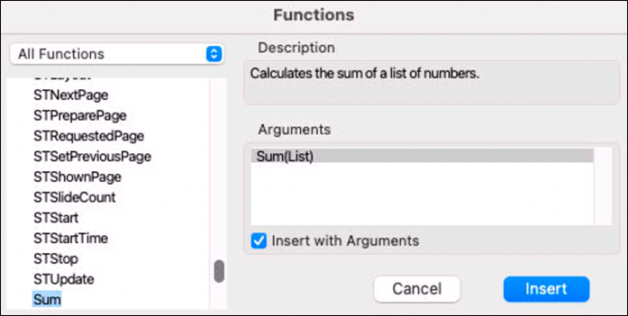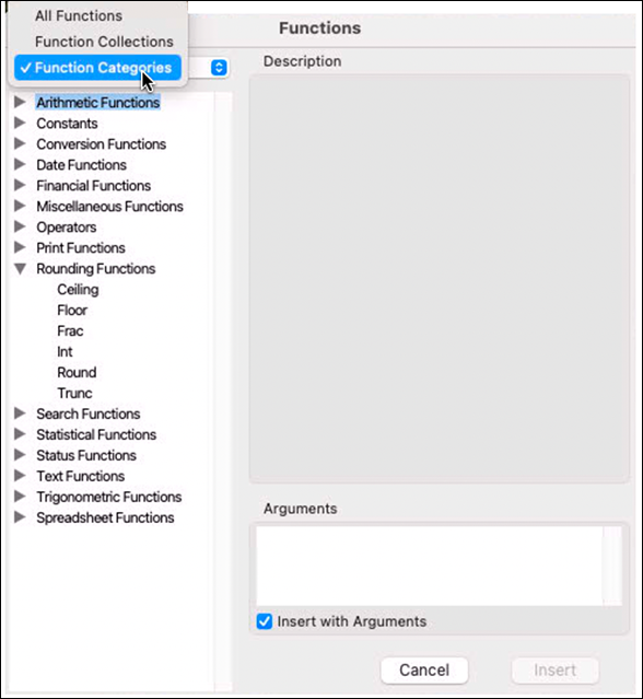Activate the option «Insert with Arguments»! Especially with more complicated functions, this is very helpful to avoid syntax errors when typing directly into the formula palette. With «Insert», the selected function is transferred to the formula palette.