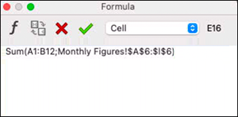 In our example, «Sum(List)» was placed into the formula window in this way. The argument «List» is selected. Note that here it says not «Range», but precisely «List». You can now drag over the ranges whose numbers are to be summed with the pointer and pressed mouse button. Such ranges can be in different spreadsheets of the document or even in other documents. Between the ranges, you must enter a semicolon each (see Fig. F-1.2). Of course, you can also type in a reference known to you, just as you could type all formulas and functions directly into the formula palette.