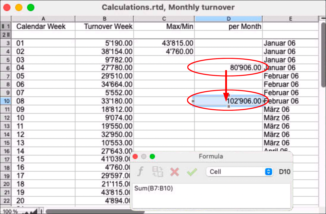 When formulas are transferred with «Copy/Paste», RagTime adjusts the inserted formulas so that the referenced cells are in the same geometric (relative) relationship to the results as in the copied formulas. In Fig. F-1.4, the distance from the upper summation in cell D6 to cell D10 is four cells. If the same formula were copied to D15 (i.e., to the last week of March), this would result in a wrong result. RagTime logically inserts the formula «Sum(B12:B15)» – thus also four cells lower.