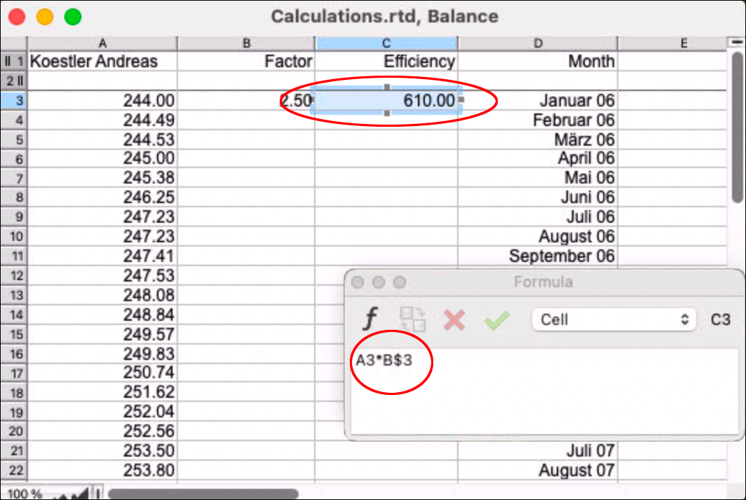 . If the formula is syntactically correct, it is inserted into your document. If RagTime detects an error, it is often too many or too few parentheses. In complex formulas, it is particularly important to check the spelling of the individual functions and the referenced ranges again. It is easy to mark one cell too many or too few with the pointer. If the formula palette blocks your view, you can move it, on the Mac also “park” it in the palettes dock (green button) – or you close it completely.