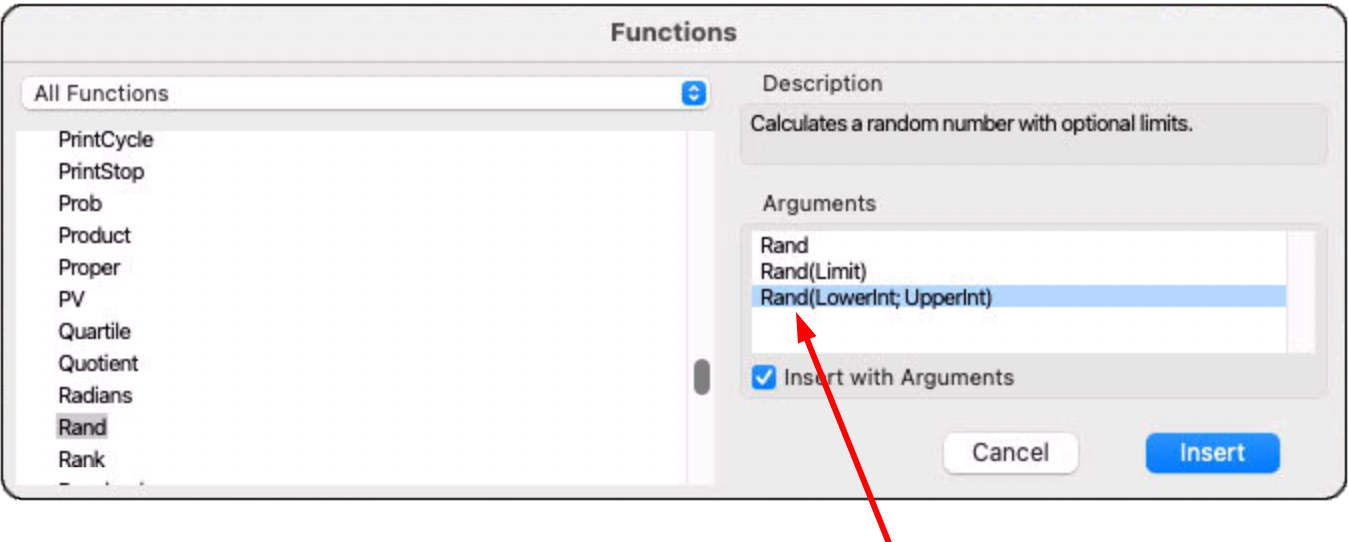 There are several variants of many functions, which differ by the type and number of arguments. As a simple example, we choose here the function «Rand». If you call the function in the functions list, three variants are displayed in the window «Arguments» (see Fig. F-1.7): without argument, the function delivers a random number between 0 and 1.