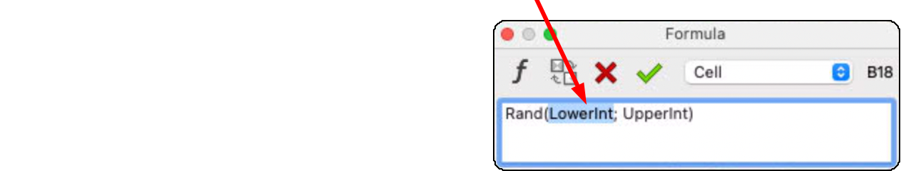 With the argument «Limit», RagTime delivers a random number between 0 and the specified upper limit value. With two arguments («LowerInt», «UpperInt»), an integer between the two limit values is generated. Select the appropriate variant of this function, and insert it into the formula palette. If you have selected the third variant, the first of the two arguments is marked in the formula, so that you can directly start entering the value, either a number, or again a formula or reference that leads to the result (see Fig. F-1.8).