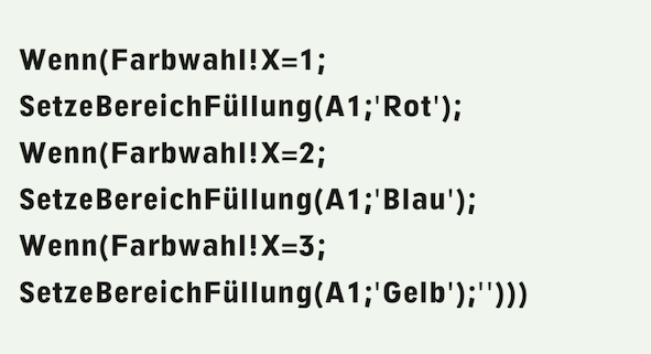 The rectangle must be the same size as the cell to be colored, positioned at 0/0 in the drawing, and use the «Container Border» line style. For the button, select the «Index is Result» option. The formula in cell A1, which is to be colored, must then be: