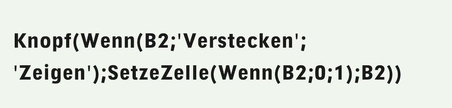 Now back to the important control in cell B2. Whether there is a «0» or a «1» is determined by the other button with text «Show/Hide», which is housed in cell A3. This button is provided with the following formula: