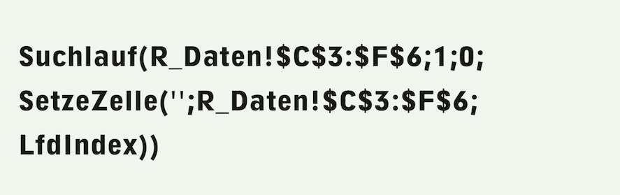 It goes without saying that the Inventory must contain a spreadsheet named «R_Data» and that the area to be deleted at the touch of a button must comprise cells C3:F6. The delete function described above can also be implemented without «Power Functions», in this case with a relatively simple search (see Formula F-2.12). Nevertheless, we prefer the previous, more readable formula with the «DeleteRange» function.