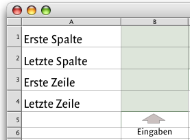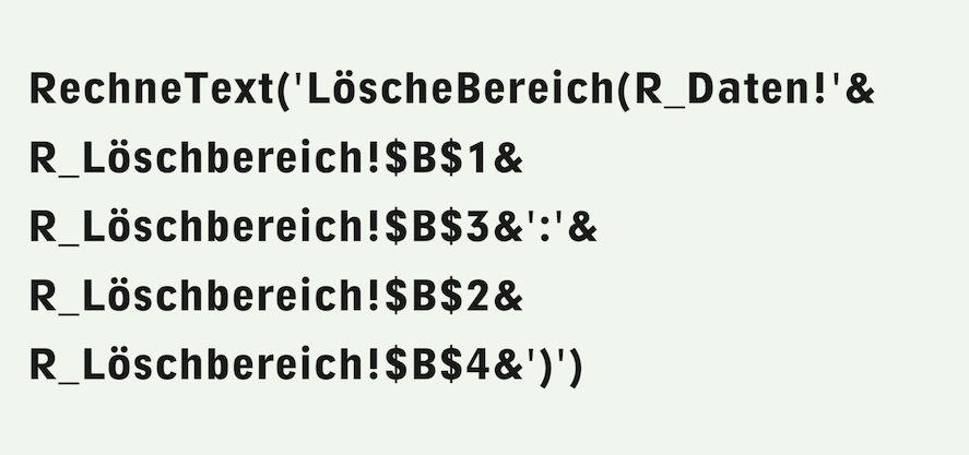 By entering a letter in B1 and B2, the columns are entered, and by entering a number in B3 and B4, the rows of the area to be deleted are entered – according to the explanatory texts in column A. These entries are then used in the deletion formula. However, this is not entirely straightforward, as an area in a formula cannot normally be defined with variable references. This time, the «MetaFormula» functions, together with the «Power Functions», come to the rescue!