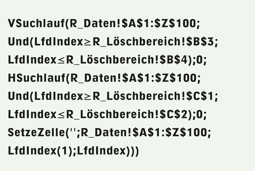 Regarding the formula for the delete button (Formula F-2.16): An outer vertical search runs through the range A1:Z100 row by row. Only for the rows that lie within the specified range is the inner horizontal search executed, which in turn runs through the relevant row from column A to column Z. Only for the columns that lie within the specified range is the SetCell command then executed, which addresses the row of the cell to be deleted with the current index of the outer (vertical) search, and the column with the current index of the inner (horizontal) search.