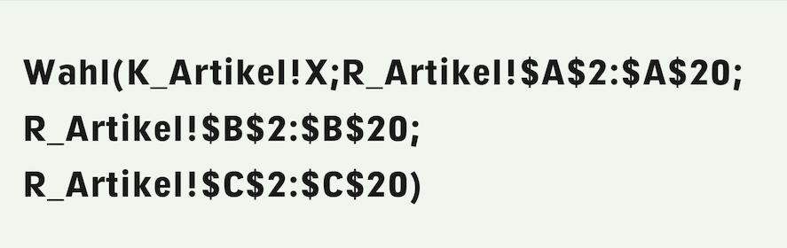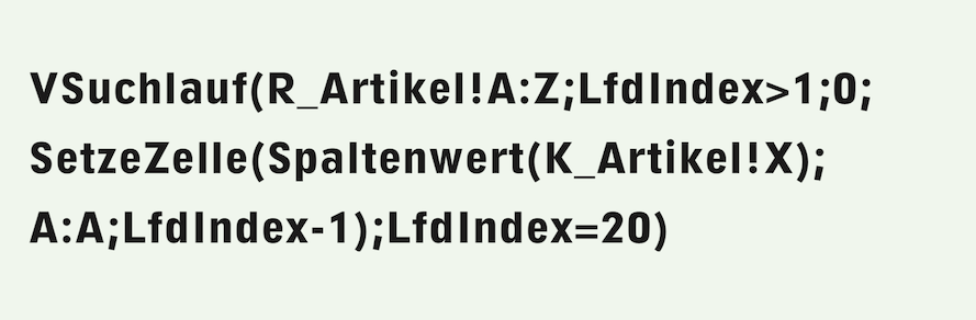 The formula searches for a range in the «R_Articles» spreadsheet that starts in column A but does not necessarily have to end in column Z. This right range boundary must include all columns filled with articles. With the condition «CurrentIndex>1», the header row, i.e., the article name, is skipped by the search. The «SetCell» function takes the value to be inserted from the current row of the search run from the column determined by the article selection made with the first pop-up menu. This value is inserted in column A, but one row higher, since the header row with the article is omitted here. The search also has a termination criterion, which is assumed here to be 20, i.e., with 19 possible execution types for an article. The formula for the second button is now much simpler and more general than in Formula F-2.18: