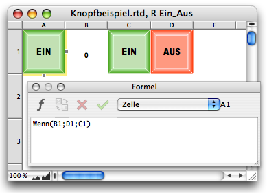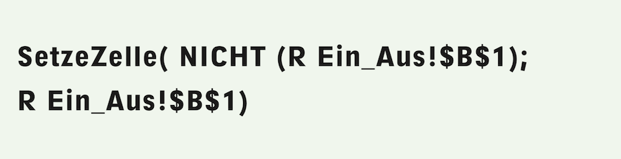 Now your On/Off switch is functional! When you click on it, the On or Off button appears alternately in cell A1 of the spreadsheet «R On_Off», i.e., in the button itself. If you press «On», a 1 will appear in cell B1, i.e., the value «True» or «On»; if you press «Off», a 0 will appear, i.e., «False» or «Off». The status of the switch can be queried anywhere using the reference «R On_Off!$B$1».