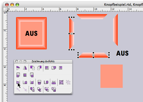 In a drawing component, you can create a square drawing in the desired button size. Four polygons with a «Red Gradient» fill are used to form a button that becomes darker toward the outside, creating a depth effect (see Fig. F-2.10). Another smaller square frame with a 40% fill forms the center of the button. Using graphic text, write «Off», select the font and size, and center the text. Using the drawing command palette, you can now align two polygons to form an angle, group them, then center all elements and group them together. To remove the distracting lines in the button drawing, create a «Transparent» line style sheet and assign it to the group.