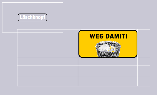 The functions are set, now all that remains is to sew the button on neatly: place the now truly invisible button exactly over cell A1 (see Fig. F-2.20), set the spreadsheet frame and cell to transparent fill, and deactivate the cell grid for both printing and the screen. Then reduce the size of the frame so that only cells A1:A3 are visible. In Fig. F-2.21, we have duplicated the entire arrangement to illustrate the action. Click on «Show» on the left button; A1 is empty. Click on «Hide» on the right button to make the button in cell A1 disappear. Finally, if you want the «Show/Hide» button to be located somewhere else in the layout, you can of course place it in a separate spreadsheet and in a smaller cell (as in Fig. F-2.22 – but then check/adjust the references again!). What the «Delete!» button itself can trigger is described in the section after next, Delete, but selectively.