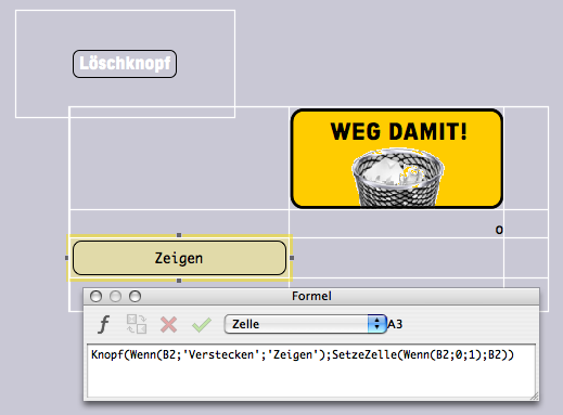 Decken Sie den Knopf mit einem Rahmen ab, der eine Rechenblattzelle enthält. Versehen Sie sowohl Rahmen wie Rechenblattzelle mit der Füllvorlage «Transparent». In diese Rechenblattzelle wird nun, in gleicher Weise wie im letzten Beispiel, per Formel eine nicht transparente Zeichnung geholt. Mit der Erweiterung «Power-Funktionen» könnte auch in diesem Fall die Zelle direkt mit einer deckenden Füllung versehen werden. Sobald die Zellfüllung transparent ist, wird der darunter liegende Knopf sichtbar.