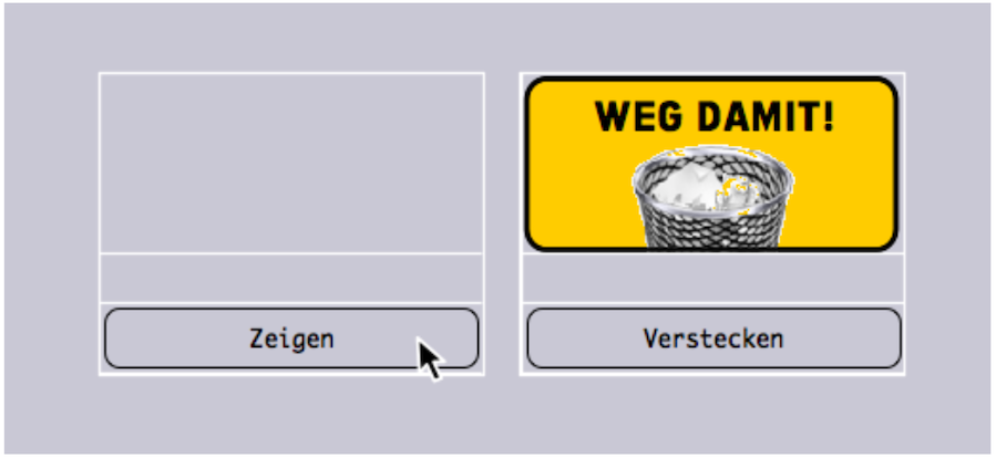 The goal is to create a delete button that deletes certain areas in a form when needed. Its button text is «Delete!». To prevent the button from being pressed unintentionally during daily use, it must first be retrieved. For this exercise, we have created a second button with the text «Show» or «Hide» if the delete button is to disappear again.