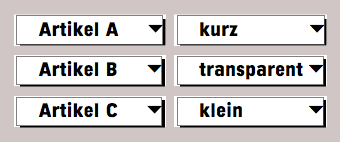 The formula with the selection function is very elegant, but as already mentioned, it is quite useless for more complex cases. Therefore, here is a more general solution: Define a new spreadsheet called «R_Execution». Column A should contain the execution types for the item selected in the first pop-up menu. They are transferred from the «R_Articles» spreadsheet to cell B1 of this spreadsheet using the following formula: