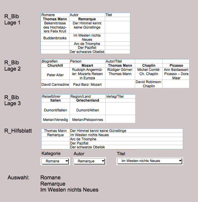 Would you like to categorize your books according to non-fiction, novels, biographies, travel guides, geographical works, etc.? We will use the «R_Lib» spreadsheet in which you have recorded your books. All non-fiction books are recorded in location 1, novels in location 2, and so on, with one location per category. When recording, we note that novels are best recorded by author, while non-fiction books are better recorded by subject area, and travel guides and geographical works by country. We do not want to pretend to be library experts here. The point is simply to use an illustrative example. See the overview in Fig. F-2.30.