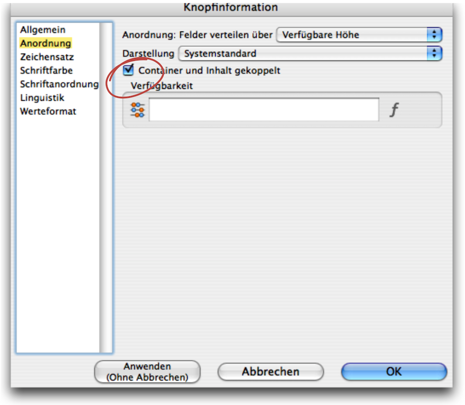 The «Arrangement» panel allows you to determine how the buttons are displayed. Under «Distribute Fields Over», the drop-down menu offers the options «Available Width», «Available Height», «One Row» or «One Column». These settings only apply to radio buttons and define their display width or height. The «Connect Container and Contents» option ensures that the size of the button is always identical to the frame size for normal buttons. Enlarging and reducing the frame therefore scales the button at the same time (similar to image containers and images). We will discuss the «Availability» function in more detail later. The remaining settings relate to the button text and are self-explanatory – they work in exactly the same way as for text.