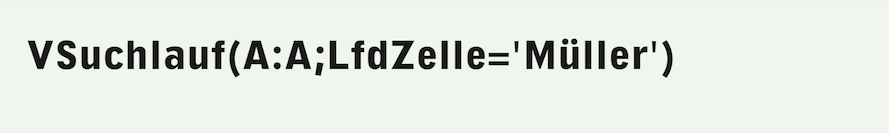 This formula counts how often the name «Müller» appears in columnãA. The search works as follows: all cells in column A are examined, starting in row 1. The «CurrentIndex» is therefore = 1, and it is increased with each row examined. The value of the function itself is set to 0.
