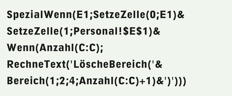 If the condition is met (a 1 in E1), the «SetCell» function immediately replaces this 1 with a 0. This ensures that the formula is only evaluated once! At the same time, however, the rest of the formula is also processed. The fact that the condition in the formula is not «E1=1» but only E1 is not a misprint. The value 1 also stands for the logical value «True» for the fulfillment of a condition and can therefore be queried directly with a reference to the cell without comparison. The subsequent «SetCell» command triggers a process in the «Personnel» spreadsheet, transferring the personnel data of the anniversary celebrants to the corresponding spreadsheet. But first, and this is the purpose of the rest of the formula, any old anniversary tables that may still exist must be deleted.