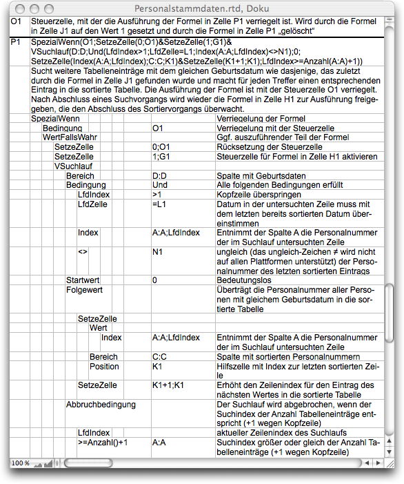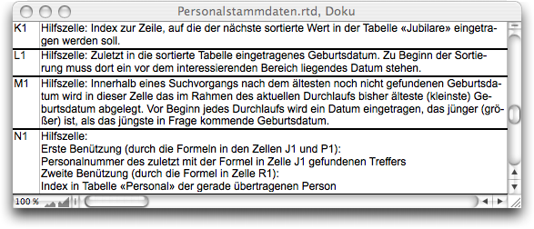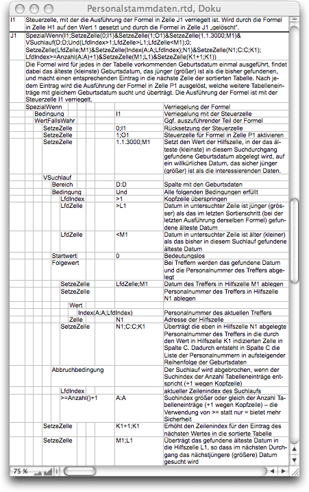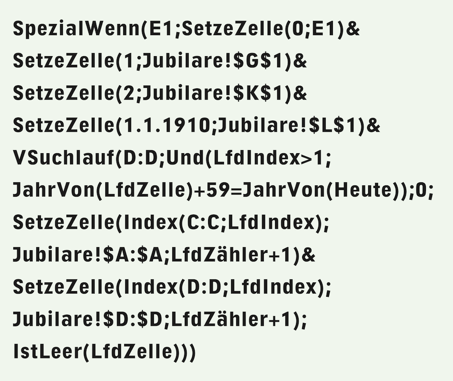 Did you notice that each time this formula is executed, only one anniversary employee, or rather their personnel number, is sorted? After the search is complete, two further «SetCell» commands are executed. The first increases the index to the anniversary table (auxiliary cell K1) by 1 so that the next time this subformula is executed, the personnel number of the anniversary employee found there is written to the next row. The second writes the date of birth found to auxiliary cell L1. It is indeed a complicated formula for sorting a single anniversary employee.