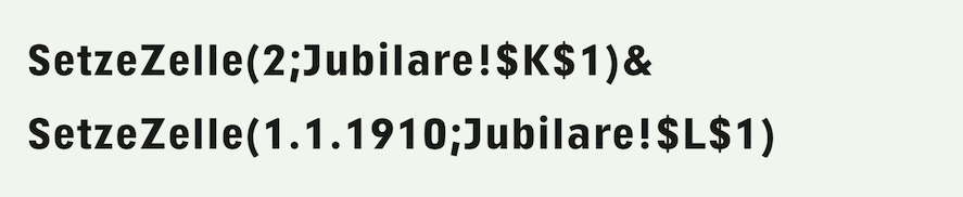 We do not need to explain again the mechanism of resetting this activation and unlocking the next subformula by activating the cell «Anniversaries!G1». For the sake of completeness, here is the difference if the «If» function were used instead of «SpecialIf»: if the control cell blocks the execution of the formula, «SpecialIf» leaves the content of the cell with the formula unchanged, while it is deleted when «If» is used. The two «SetCell» commands of the “locking mechanism” are followed by two more, which enter initial values for a subsequent processing step in auxiliary cells of the anniversary table: