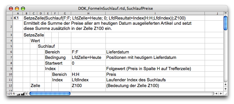 Finally, each function used is explained with its arguments. Each nesting is made visible by corresponding indentation. For the outermost function («SetCell»), the two arguments are found in the next indentation level: first the function «Search», which determines the value to be inserted, then the addressing where this value is to be inserted. Similarly, the search function is “dissected” at the next level.