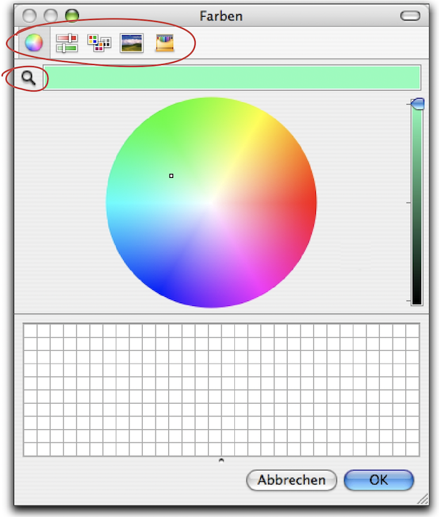 Auf dem Mac kann in einer Werkzeugleiste gleich zwischen mehreren solcher Werkzeuge ausgelesen oder mit der Lupe die Farbe eines beliebigen Punktes im Layout, auch in einem Bild, übernommen werden. Je nach gewähltem Werkzeug stehen weitere Optionen zur Verfügung.